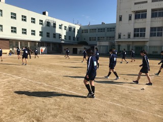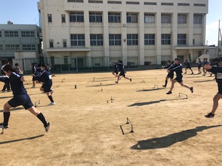 ライン、コーン、ミニハードルを使って身体を動かしています。