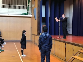 3年2組 細谷さんが、税の作文で優秀賞をとり、全校集会で表彰されました。