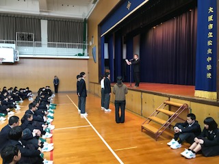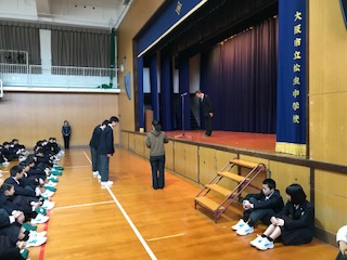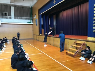 全校集会で表彰されました。空手の試合ジュニアチャレンジカップで2年生女子が3位になりました。また、卓球部が8ブロック大会で男子ダブルスで優勝、男子2年シングルスで、2位と3位、男子1年生シングルスで優勝の成績を収めました。