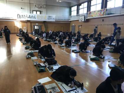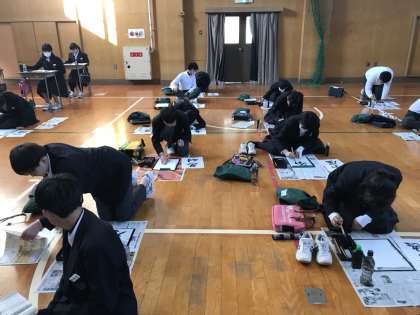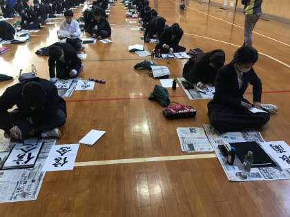 本日、2年生が体育館で席書会を行いました。真剣に書いていました。