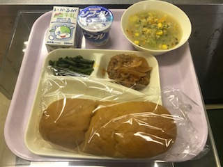 本日の給食は、牛乳、パンプキンパン、煮込みハンバーグ、コーンスープ、三度豆のサラダ、ヨーグルトです。