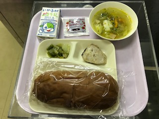 今日のメニューは、牛乳、かつおのガーリックマヨネーズ焼き、スープ、レタスサラダです。