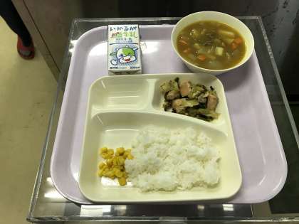 本日のメニューは、牛乳、さけのちゃんちゃん焼き、とうもろこしごはん、スープカレーです。