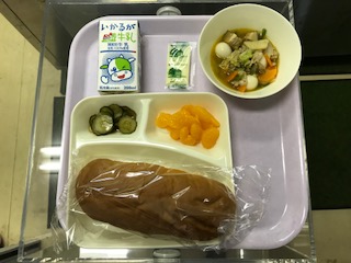本日のメニューは、牛乳、コッペパン、八宝菜、きゅうりの中華あえ、みかんです。