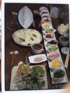 半田そうめんと野草のてんぷら(ゆきのした、柿の葉、よもぎ等)、ごぼうとタケノコの煮物のてんぷら。