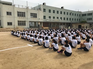 本日の全校集会は、体育大会全体練習のため、運動場で行われました。