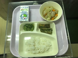 本日のメニューは、牛乳、ご飯、ちくわの磯辺揚げ、鶏肉とさといもの煮物、あっさりきゅうりです。
