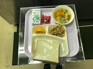 本日のメニューは、牛乳、食パン、いちごジャム、パエリア、ウインナーとキャベツのスープ、オレンジでした。