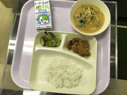 本日のメニューは、牛乳、ご飯、豚肉の香味あげ、みそ汁、きゅうりの甘酢づけです。