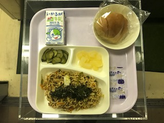 本日のメニューは、牛乳、黒糖パン、焼きそば、きゅうりの甘酢漬け、洋なしです。