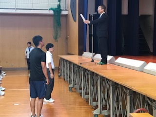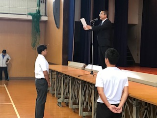 全校集会で表彰されました。(柔道部、3年松岡君)