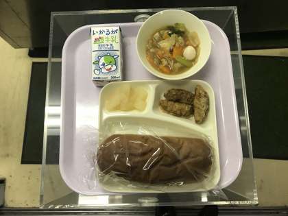 本日のメニューは、牛乳、黒糖コッペパン、揚げぎょうざ中華煮、和なしでした。