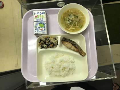 本日のメニューは、牛乳、ご飯、さけのしょうゆ風味焼き、五目汁、高野豆腐の炒り煮です。