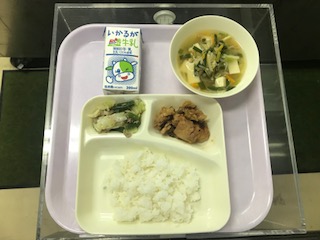 本日のメニューは、牛乳、ご飯、鶏肉のチリソース焼き、豆腐とワンタンの皮のスープ、中華いためです。