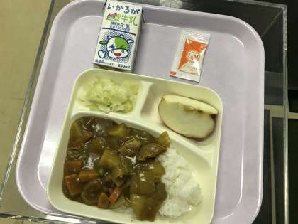 本日のメニューは、ポークカレーライス、キャベツのサラダ、りんごでした。