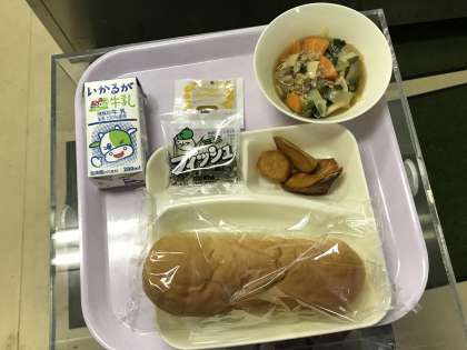 本日のメニューは、牛乳、コッペパン、豚肉といかの中華煮、大学いも、ミニフィッシュでした。