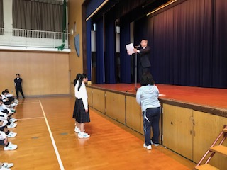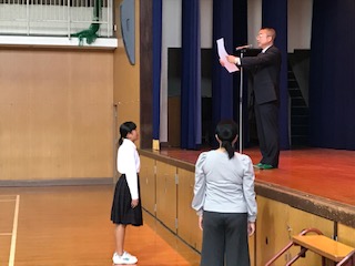 本日全校集会で、絵画・写真コンクールで佳作賞、1年田中さん、半田さん、中尾さん、ジュニアオリンピックリレーで第7位、3年東野さんが表彰されました。