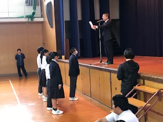 本日全校集会で、後期生徒会役員、専門委員の認証式がありました。