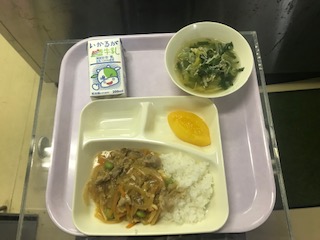 10月31日のメニューは、牛乳、ご飯、ピリ辛丼、中華スープ、黄桃でした。