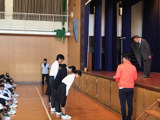 本日全校集会で卓球部が表彰されました。SNW杯で2年生、男子団体優勝、代表上西くん、女子団体3位、代表古川さん、男子個人優勝伊江くん、優秀選手、山出くん、池畑さん、最優秀選手、伊江くんでした。