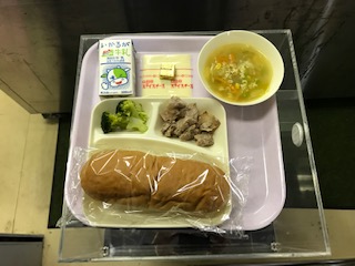 本日のメニューは、牛乳、コッペパン、豚肉のガーリック焼き、マカロニと野菜のスープ、ブロッコリーのサラダ、スライスチーズでした。