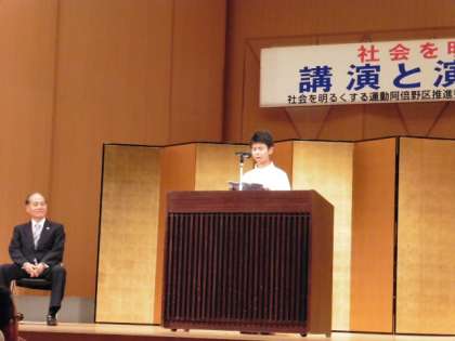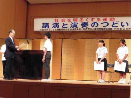 終業式の翌日、阿倍野区民センターの大ホールで、表彰式が行われました。阿倍野区5中学校からそれぞれ1名ずつが表彰式に臨み、本校は野口一真くんが受賞し、さらに代表として作文を朗読するという栄誉にあずかりました。しっかりした朗読のようすに皆さん、驚かれていました。夏休みに入って、第1号の受賞、本当におめでとう!
