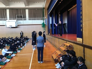 全校集会で吹奏楽部が表彰されました。アンサンブルコンテストで銀賞を獲得しました。