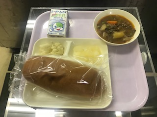 本日のメニューは、牛乳、黒糖コッペパン、ビーフシチュー、カリフラワーのピクルス、和なしでした。