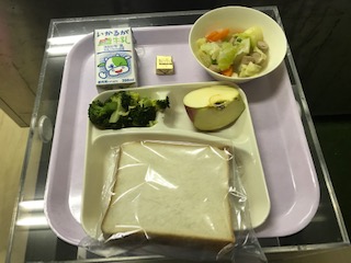 本日のメニューは、牛乳、食パン、鶏肉と野菜の洋風煮、ブロッコリーのサラダ、りんごでした。