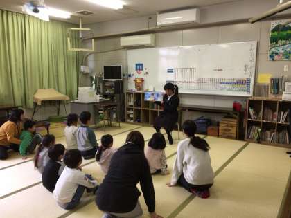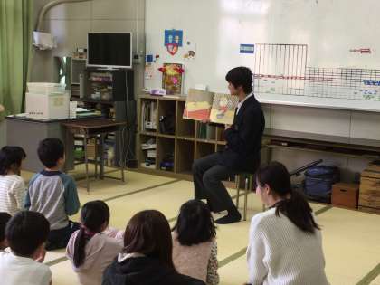 本日、1.2年生文化委員が、金塚小学校のいきいきに、絵本の読み聞かせに行きました。