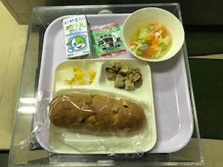 本日のメニューは、牛乳、レーズンパン、まぐろの醤油マヨネーズ焼き、鶏肉とじゃがいものスープ煮、だいこんのサラダ、ソフト黒豆でした。