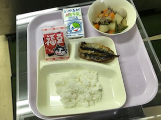 本日のメニューは、牛乳、ご飯、いわしのしょうがじょうゆかけ、含め煮、いり大豆でした。