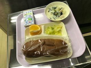本日のメニューは、牛乳、黒糖コッペパン、ほうれん草のクリームシチュー、キャベツのサラダ、いよかんでした。