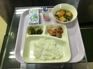 本日のメニューは、鶏肉のチリソース焼き、中華煮、きゅうりの中華あえ、発酵乳でした。