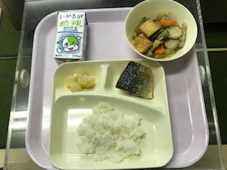 本日のメニューは、牛乳、ご飯、さばの塩焼き、あつあげと里芋の煮もの、だいこんのみそ煮です。