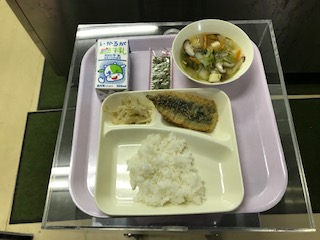 本日のメニューは、牛乳、ご飯、いわしのフライ、五目汁、もやしのショウガ醤油かけ、やきのりでした。