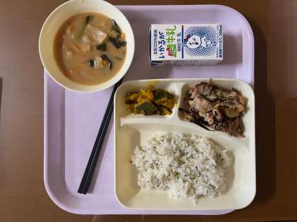今日の給食は、豚肉の甘辛焼き・みそ汁・かぼちゃのいとこ煮・菜飯・牛乳です。
