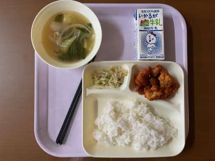 今日の給食は、ヤンニョムチキン・豆腐のスープ・切り干し大根のナムル・ごはん・牛乳です。
