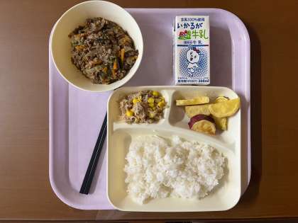 今日の給食は、マーボーなす・ツナと野菜の炒め物・焼きさつまいもの甘みつかけ・ごはん・牛乳です。
