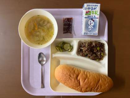 今日の給食は、牛肉のデミグラスソース煮・ウインナーのスープ・きゅうりのピクルス・コッペパン・いちごジャム・牛乳です。