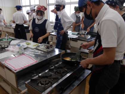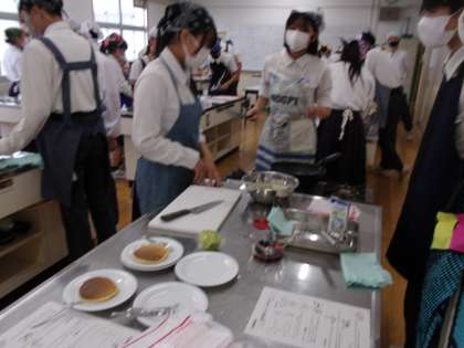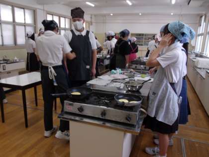 3年1組家庭科の調理実習では、パンケーキを作っています。