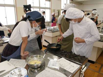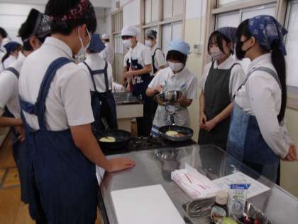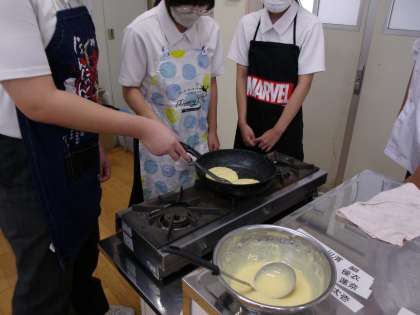 3年2組家庭科の調理実習で、パンケーキを作っています。