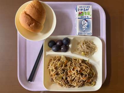 今日の給食は、オイスターソース焼きそば・もやしの中華あえ・巨峰・ミニコッペパン・牛乳です。