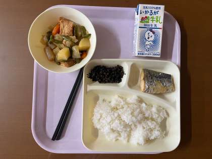 今日の給食は、さごしのおろし醤油かけ・含め煮・牛ひじきそぼろ・ごはん・牛乳です。