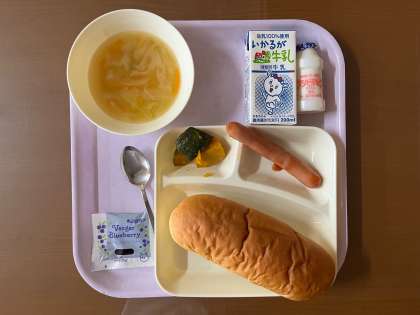 今日の給食は、ウインナーのケチャップソース・スープ・焼きかぼちゃ・発酵乳・コッペパン・ブルーベリージャム・牛乳です。