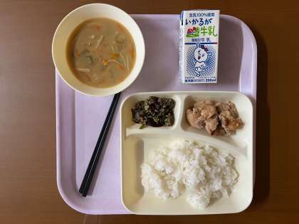 今日の給食は、鶏肉の照り焼き・とうがんの味噌汁・なすのそぼろ炒め・ごはん・牛乳です。