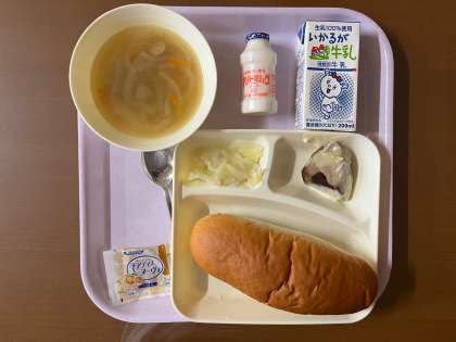今日の給食は、かつおのガーリックソースかけ・ウインナーとじゃがいものスープ・キャベツのサラダ・発酵乳・コッペパン・みかんジャム・牛乳です。
