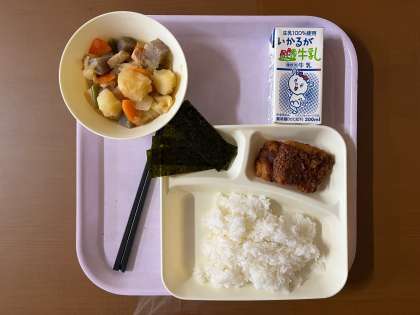 今日の給食は、みそカツ・じゃがいもと野菜の煮物・焼きのり・ごはん・牛乳です。