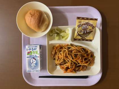 今日の給食は、イタリアンスパゲッティ・サワーキャベツ・カレーフィッシュ・ミニコッペパン・牛乳です。