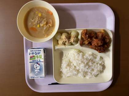 今日の給食は、とり天・どさんこ汁・抹茶団子・きな粉・ごはん・牛乳です。